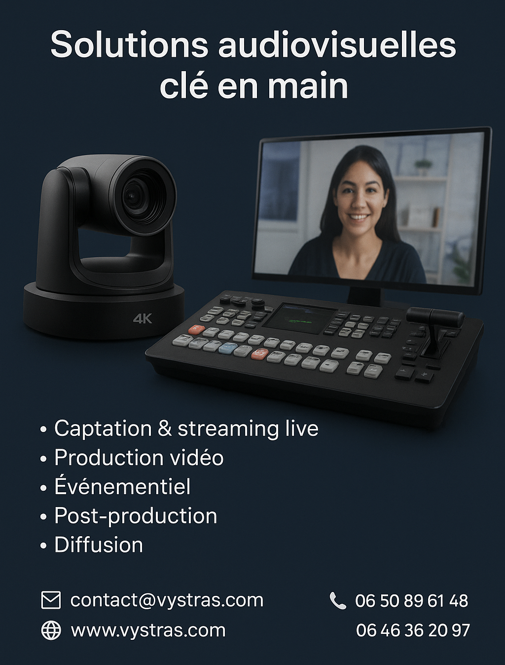 Nous proposons la captation vidéo multi-caméras, le streaming en direct, la gestion du son et de la régie, ainsi que la location et l’installation d’écrans géants LED.